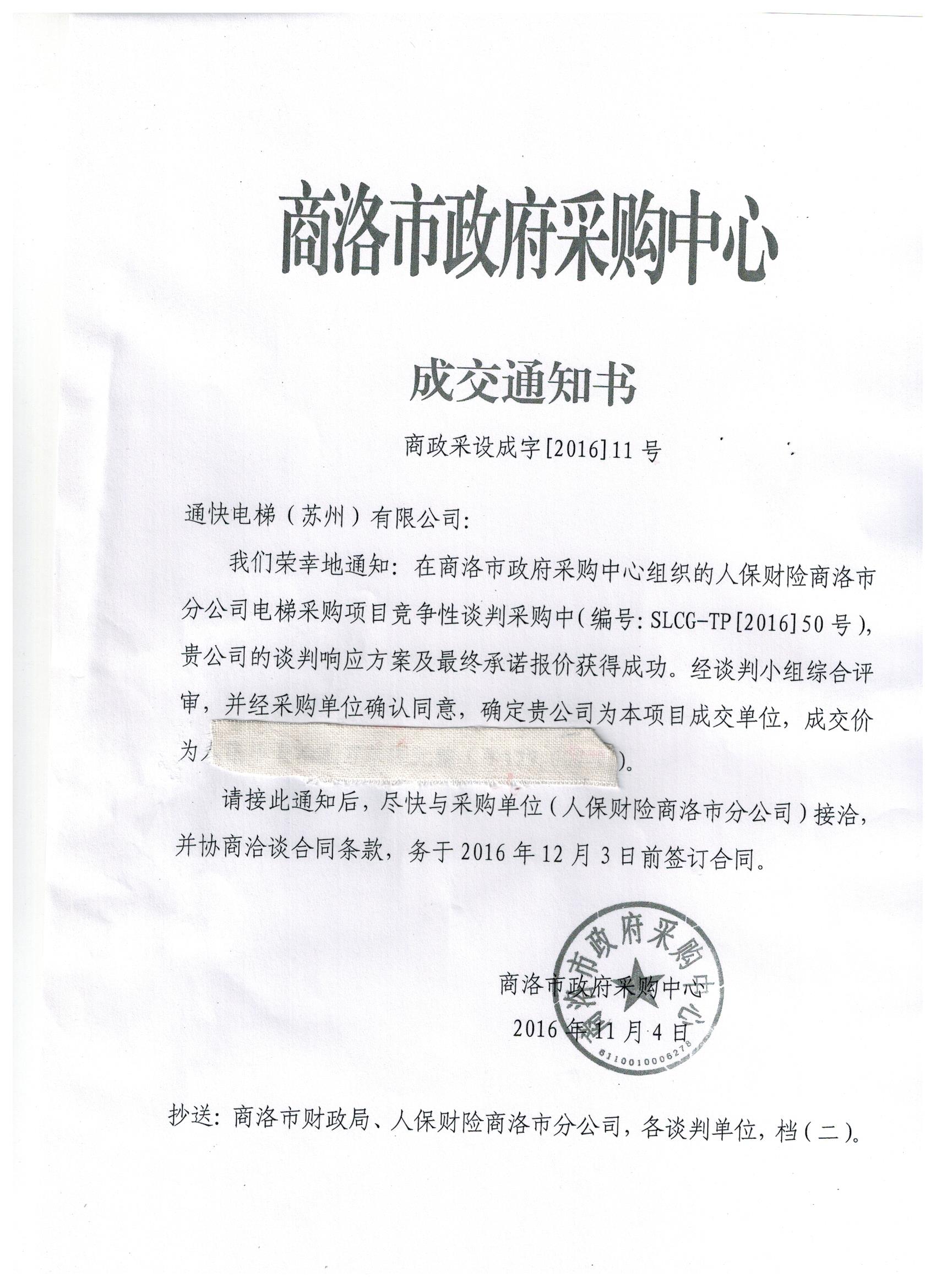 通快電梯(蘇州)有限公司中標(biāo)人保財(cái)險(xiǎn)商洛分公司電梯項(xiàng)目